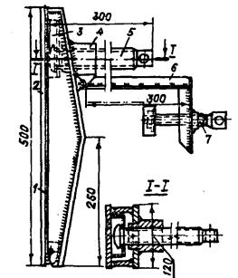 1, 2 - щеки; 3 - швеллер, 4 - гайка; 5 - разводной винт; 6 - шарнирно-накладной кронштейн; 7 - прижимной винт
