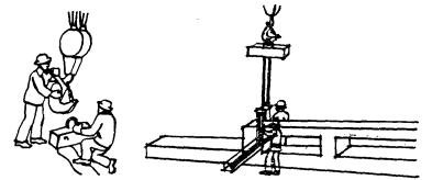 Монтажник М1 дает машинисту крана сигнал приподнять колонну от земли на 20 - 30 см. Монтажник М3 проверяет надежность строповки, после чего монтажник М1 дает сигнал машинисту крана К подвести колонну к стакану фундамента. Монтажники М2 и М4 принимают колонну на высоте 30 см над стаканом фундамента. По сигналу монтажника М1 машинист крана плавно опускает колонну, а