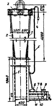 1 - кран на гусеничном ходу; 2 - передвижной контейнер для инструментов; 3 - положение колонны до перекантовки; 4 - положение колонны перед подъемом; 5 - фундаменты стаканного типа; 6 - ящик с бетонными клиньями; 7 - клинья разводные стальные; 8 - теодолиты; 9 - места стоянок крана