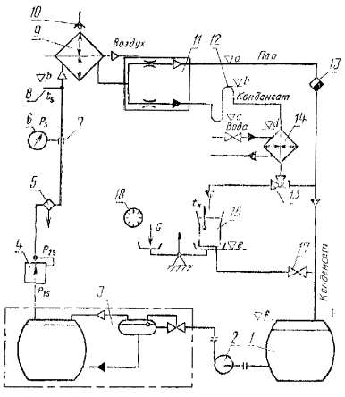 1 - бак конденсатный; 2 - насос; 3 - местный или централизованный парогенератор; 4 - клапан редукционный гидравлический (поддерживающий постоянное давление Р2s); 5 - сепаратор (водоотделитель); 6 - манометр; 7 - приемники давления; 8 - термометр; 9 - воздухонагреватель; 10 - клапан обратный; 11 - делитель парового и конденсатного потоков; 12 - гидрозатвор (по конденсату); 13 - конденсатоотводчик; 14 - охладитель конденсата; 15 - вентиль трехходовой; 16 - устройство для измерения расхода конденсата; 17 - вентиль запорный; 18 - секундомер
