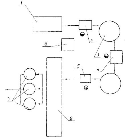 Рис. 49. Тросовая электропроводка а - коробка ответвительная У257 для выполнения разъемных присоединений светильников к магистральной осветительной сети; б - узел ответвления к светильнику; в - пример подвески и подключения светильника при выполнении тросовых электропроводок с помощью подвеса; г - общий вид электропроводки; д - электропроводка в межферменном пространстве Рис. 50. Схема технологической сборки тросовых электропроводок 1 - инвентарный барабан; 2 - мерно-подающее устройство; 3 - магазин для провода; 4 - вспомогательное устройство; 5 - стенд для обработки проводов; 6 - вертушка приемная Таблица 8 Монтаж тросовых электропроводок