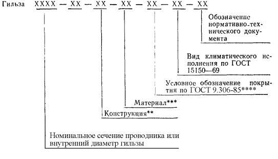 Примечание. Допускается в условном обозначении не указывать материал, конструкцию и обозначение покрытия, если стандарт на конструкцию и размеры гильз устанавливает материал одного наименования, одну конструкцию и одно покрытие.