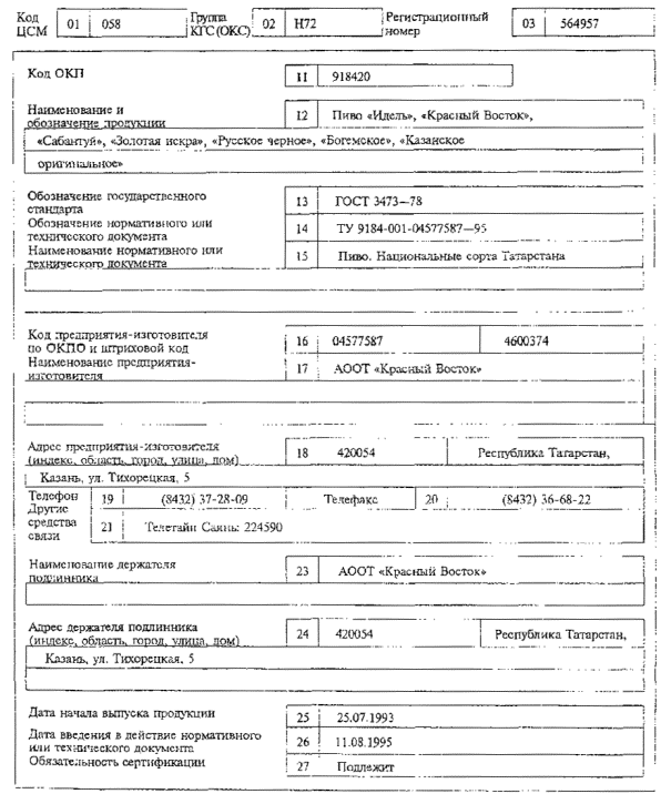на пиво «Идель», «Красный Восток», «Сабантуй», «Казанское оригинальное», «Золотая искра» - № 01.04.1656 до 27.09.1999