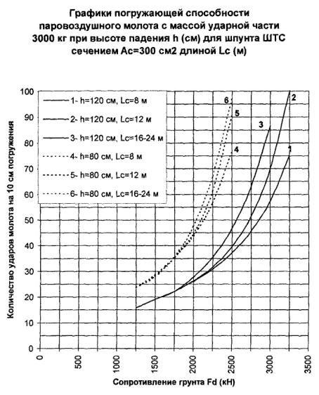 300 см2, длине 24 м и сопротивлении погружению Fd = 3000 кН погружающая способность молота с поршнем 5000 кг согласно