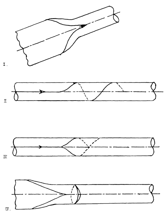 Наиболее часто встречаются остановки распространяющейся по газопроводу трещины винтовым торможением (тип II) и раздвоением трещины (тип III). Природа их однотипна: при отклонении трещины от своего прямолинейного движения в месте перегиба возникает вторичная трещина (надрыв металла), которая под действием расширяющегося газа распространяется по спирали, огибая трубу со стороны диаметрально противоположной стороне распространения первичной трещины.