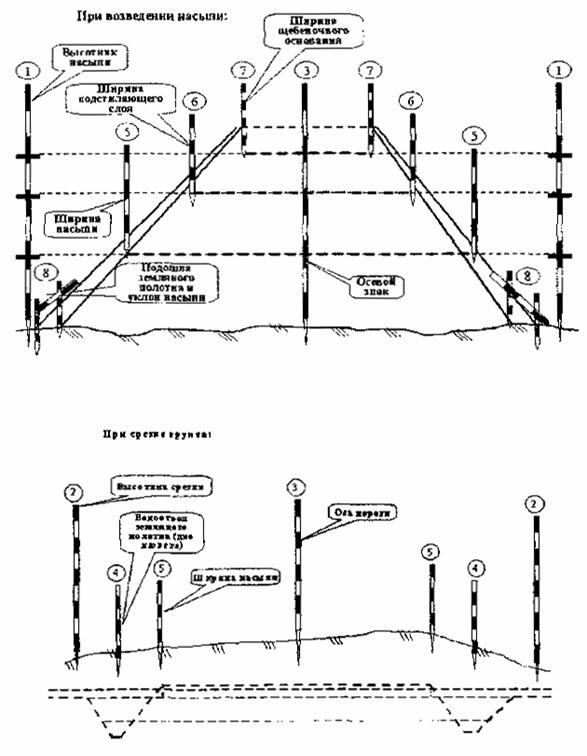 1 - высотник насыпи; 2 - высотник срезки; 3 - осевой геодезический знак; 4 - обозначение водоотвода зем. полотна (дно кювета); 5 - обозначение ширины насыпи; 6 - обозначение ширины подстилающего слоя; 7 - обозначение ширины щебеночного основания; 8 - обозначение подошвы зем. полотна и уклона насыпи