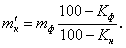 где mф - фактическая масса партии, кг; Wн - нормированная влажность, %; Wф - фактическая влажность, %; Kф - фактическое содержание костры и сорных примесей %; Kн - нормированное содержание костры и сорных примесей, %. Вычисление производят до первого десятичного знака с последующим округлением до целого числа. При фактической влажности волокна ниже 8 % партию принимают по фактической массе с учетом содержания костры и сорных примесей. Кондиционную массу партии (m'к) в килограммах вычисляют по формуле