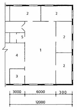Экспликация 1 Здание управления 2 Жилой дом 3 Стоянка на 10 автомашин (для посетителей) 4 Стоянка для служебных автомашин 5 Площадка для мусоросборников Приложение 2Пример планировочного решения муниципального управления социальной защиты населения на 50 сотрудников.План I этажа.