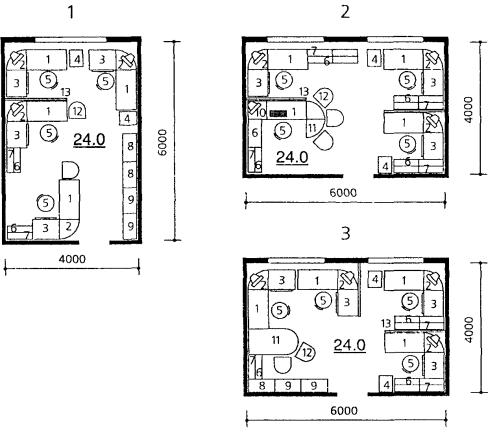 Рис. 4.26. Рабочее место сотрудника (без приема посетителей). Варианты 1, 2, 3. Экспликация.