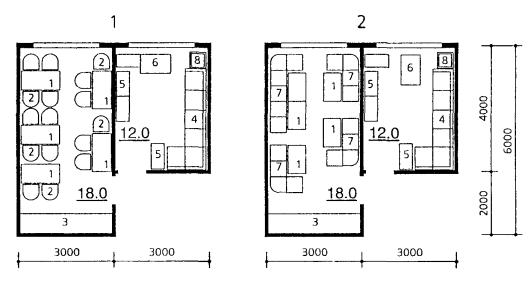 Рис. 4.17. Рабочее место начальника управления. Варианты 1, 2. Экспликация 1. Стол 2. Кресло рабочее подъемно-поворотное 3. Кресло для посетителей 4. Мобильная тумба 5. Боковой стол 6. Место для компьютера (или пишущей машинки) 7. Стеллаж (шкаф для документов) 8. Корзина для мусора Рис. 4.18. Рабочее место секретаря. Варианты 1, 2. Экспликация. 1. Стол рабочий 2. Кресло подъемно-поворотное 3. Кресло для посетителей 4. Мобильная тумба 5. Место для компьютера (или пишущей машинки) 6. Боковая тумба 7. Стеллаж (шкаф для документов) 8. Стол-приставка угловой для компьютера Рис. 4.19. Рабочее место секретаря. Варианты 3, 4. Экспликация.