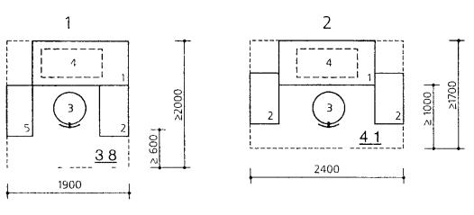 Рис. 4.27. Рабочее место оператора текстового компьютера и машинистки. Варианты 1, 2. Экспликация 1 Стол рабочий 2 Тумба боковая 3 Кресло рабочее подъемно-поворотное 4 Ксерокопировальный аппарат 5 Шкаф для документов Рис. 4.28. Рабочее место оператора настольного ксерокопировального аппарата. Варианты 1, 2. Приложение 1Схема генерального плана участка управления социальной защиты населения. (Встроенно-пристроенный вариант).