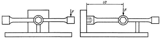 Пример условного обозначения ключа с сочетанием размеров зевов 17×19×22×24 исполнения 1, нормальной точности Н, группы прочности А, с хромовым покрытием толщиной 9 мкм: Ключ 7812-0601.Н А Х9 ГОСТ Р 51981-2002 То же, исполнения 2: Ключ 7812-0602. Н А Х9 ГОСТ Р 51981-2002 4. Технические требования4.1 Ключи изготовляют в соответствии с требованиями настоящего стандарта по рабочим чертежам, утвержденным в установленном порядке. 4.2 Ключи изготовляют группы прочности А по ГОСТ 2838 из стали марки 40Х по ГОСТ 4543. Допускается применять сталь других марок, механические свойства которой в термообработанном состоянии не ниже, чем стали марки 40Х. 4.3 Ключи должны иметь твердость 40,5 ... 45,5 HRC. 4.6 Предельные отклонения размеров присоединительных квадратов - по ГОСТ 24372. 4.7 Допуск соосности зевов относительно наружных головок: - 0,8 мм для головок диаметром до 36 мм; - 1,0 мм для головок диаметром свыше 36 мм. 4.8 Допуск на половину длины ключа должен быть ± 3 % длины ключа l. Угол, образованный двумя рукоятками ключа, должен быть 90° ± 2°. 4.9 Параметр шероховатости Rz поверхностей ключей по ГОСТ 2789 должен быть, мкм, не более: - наружной цилиндрической поверхности рабочей головки и внутреннего шестигранника - 40,0; - остальных поверхностей - 80. 4.10 Ключи должны иметь одно из защитно-декоративных покрытий, указанных в ГОСТ 2838. 4.11.1 На ключе должны быть нанесены: - товарный знак предприятия-изготовителя; - сочетание размеров зевов. 4.11.2 Маркировка транспортной тары и упаковка ключей - по ГОСТ 18088. 5. Требования безопасности5.1 Ключи следует применять только для обслуживания крепежа с размерами «под ключ», соответствующими размеру зева ключа. 5.2 Безопасность ключей в работе определяет их прочность при заданном крутящем моменте в соответствии с требованиями ГОСТ 2838 для группы прочности А. 6. Правила приемки6.1 Приемка ключей - по ГОСТ 26810. 7. Методы испытаний7.1 Размеры ключей проверяют универсальными и специальными средствами измерений. 7.2 Твердость ключей определяют по ГОСТ 8.064. 7.3 Шероховатость поверхностей ключей проверяют сравнением с образцами шероховатости или профилометрами (профилографами). 7.4 Прочность ключей контролируют на испытательном стенде. Гаечные торцовые ключи с внутренними шестигранниками устанавливают зевом на оправку, имеющую в поперечном сечении форму правильного шестигранника. Номинальные размеры шестигранных оправок должны быть равны минимальным охватывающим размерам «под ключ» нормальной точности по ГОСТ 6424. Твердость оправок 52 ... 56 HRC. Прочность оправок должна исключать возможность их деформации при испытаниях ключей. Схема приложения нагрузки F указана на рисунке 3. Во избежание прогиба ключа, который может быть при приложении нагрузки F на длине ½ l между точкой приложения нагрузки F и оправкой, необходимо применять упор, как показано на рисунке 3. Рисунок 3 Во время испытаний значение крутящего момента должно плавно возрастать до значений, указанных в ГОСТ 2838. Ключи должны выдерживать не менее трех нагружений. После испытаний не допускается наличие остаточных деформаций ключей (трещины, изменения размеров зева), снижающих прочность ключей и точность размеров зева. 8. Гарантии изготовителя8.1 Изготовитель гарантирует соответствие ключей требованиям настоящего стандарта при соблюдении условий эксплуатации и транспортирования. 8.2 Гарантийный срок эксплуатации ключей - 9 мес с