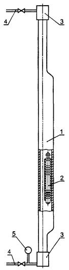 где Р1 и Р2 крайние значения усредненной линии участка А диаграммы; dx - максимально эффективное перемещение штока клапана в пределах наклонной линии участка А. 5.4.3.4 Испытание клапана на работоспособность 5.4.3.4.1 Испытание проводят на стенде (рисунок 13), при этом утяжеленная штанга должна быть длиной (1500 ± 80) мм и номинальным диаметром 38,1 мм; стержень механического ясса должен быть длиной (500 ± 50) мм и номинальным диаметром 38,1 мм. Рисунок 13 - Стенд для испытания установки клапана 5.4.3.4.2 Скважинную камеру устанавливают в аппарат для измерения открывающего клапан давления. Посадку клапана в карман скважинной камеры осуществляют при помощи пяти ударов яссом со свободно падающим утяжеленным стержнем. Спускной инструмент освобождают движением ясса вверх. Измеряют открывающее давление клапана, вставленного в карман скважинной камеры. Измеряют и регистрируют температуру окружающей среды. Результаты испытаний регистрируют в протоколе по форме 2 (приложение А). 5.4.4.4.3 Результаты испытаний оформляют актом, в котором указывают обозначение и заводской номер клапана, дату, результаты испытания с указанием: - давления установки клапана; - давления опрессовки; - диаграмм перемещения штока в зависимости от давления на клапан; - наилучшей наклонной линии участка А диаграммы; - нормы нагрузки сильфонной сборки; - максимально эффективного перемещения клапана. ПРИЛОЖЕНИЕ А(справочное) Форма 1 Форма протокола испытаний