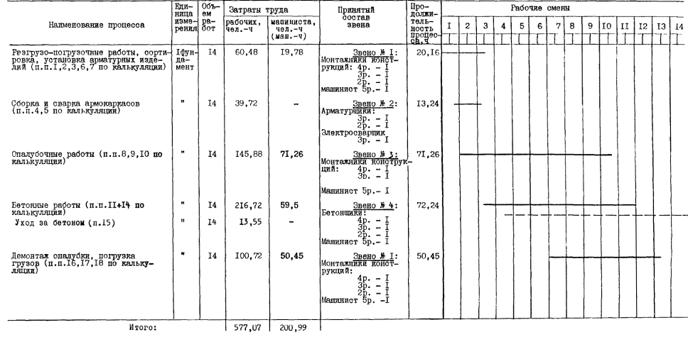 Калькуляция затрат труда, машинного времени и заработной платы составлена для варианта возведения монолитных железобетонных фундаментов объемом 20 м3 при подаче бетонной смеси гусеничным стреловым краном. 5. ГРАФИК ПРОИЗВОДСТВА РАБОТ НА 1 ЗАХВАТКУТаблица 4