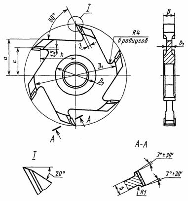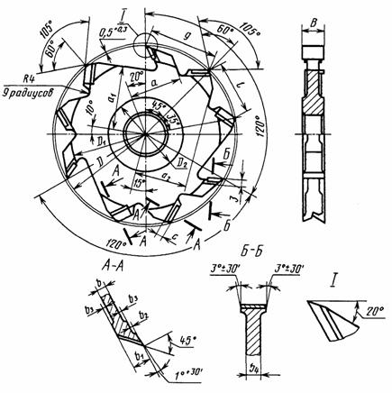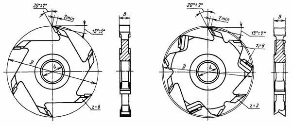 Пример условного обозначения фрезы типа 1, исполнения 1 диаметром D = 125 мм, d = 32 мм, шириной В = 10 мм: Фреза 3202-0189 ГОСТ 11291-81 2. ТЕХНИЧЕСКИЕ ТРЕБОВАНИЯ2.1. Фрезы должны изготовляться в соответствии с требованиями настоящего стандарта по рабочим чертежам, утвержденным в установленном порядке. 2.2. Режущие пластины зубьев фрез исполнения 1 должны изготовлять из твердого сплава группы ВК по ГОСТ 3882, а фрез исполнения 2 - из быстрорежущей стали по ГОСТ 19265. (Измененная редакция, Изм. № 5). 2.3. Корпуса фрез должны изготовлять из стали марки 40Х по ГОСТ 4543 или марки 45 по ГОСТ 1050 или из стали других марок, обеспечивающих качество фрез не ниже установленных требованиями настоящего стандарта. (Измененная редакция, Изм. № 1). 2.4. Твердость корпусов должна быть не менее 180 НВ. (Измененная редакция, Изм. № 2). 2.5. Твердость пластин из быстрорежущей стали после напайки должна быть 59...64 HRCэ. (Измененная редакция, Изм. № 1). 2.6. Пластины твердого сплава следует паять сплавом марки Л63 по ГОСТ 15527. Закаленные пластины из быстрорежущей стали следует паять припоем марки ПСр40 по ГОСТ 19738. (Измененная редакция, Изм. № 5). 2.6а. Пластины твердого сплава и закаченные пластины, припаянные припоем или сплавом, не указанным в п. 2.6, должны обеспечить эксплуатационную прочность и надежность не ниже марок, указанных в настоящем стандарте. (Введен дополнительно, Изм. № 5). 2.7. Толщина слоя припоя между опорной поверхностью корпуса фрезы и пластиной после пайки должна быть не более 0,15 мм для фрез шириной до 10 мм и не более 0,25 мм для фрез шириной св. 10 мм. По нижней опорной поверхности допускается утолщение слоя припоя до 0,4 мм. Видимый разрыв слоя припоя по контуру пайки не должен быть более 5 % его общей длины. (Измененная редакция, Изм. № 2). 2.8. Фрезы не должны иметь трещин, черновин, забоин, заусенцев, следов коррозии. 2.9. На необработанных поверхностях литых корпусов фрез не должно быть недоливов, плен, засоров, пористости. (Измененная редакция, Изм. № 1). 2.10. Поверхности фрез, кроме посадочного отверстия, опорных торцов, а также поверхностей, образующих режущие кромки, должны иметь защитное покрытие по ГОСТ 9.301. Допускается окраска указанных поверхностей эмалью марки НЦ-132 по ГОСТ 6631. (Измененная редакция, Изм. № 2). 2.11. Режущие кромки зубьев фрез не должны иметь трещин, завалов, выкрашиваний и следов прижогов. (Измененная редакция, Изм. № 1). 2.12. Параметры шероховатости поверхностей фрез по ГОСТ 2789 должны быть, мкм, не более: Rz ≤ 1,6 - передних поверхностей зубьев фрез исполнения 1; Rz ≤ 3,2 2; Rz ≤ 1,6 - задних и боковых поверхностей зубьев фрез исполнения 1; Rz < 6,3 2; Ra < 1,25 поверхностей посадочного отверстия и опорных торцов. (Измененная редакция, Изм. № 2). 2.13. Предельные отклонения размеров фрез не должны быть более: h15 - наружного диаметра фрез; Н7 - диаметра посадочного отверстия; h9 - ширины фрез. 2.14. У фрез типа 2 выступание режущих зубьев по ширине над подрезающими не допускается. Превышение подрезающих зубьев не должно быть более 0,15 мм с каждой стороны фрезы. 2.15. Не допускается выступание опорных торцов по отношению к боковым режущим кромкам более 0,2 мм с каждой стороны фрез. 2.16. Допуск радиального биения режущих кромок зубьев фрез относительно оси посадочного отверстия и при опоре на торец - 0,05 мм. 2.17. Допуск торцового биения режущих кромок зубьев фрез типов 1 и 2 и режущих кромок подрезающих зубьев фрез типа 2 относи