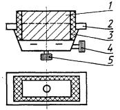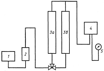 < 1000 Па величину За единицу измерения коэффициента газопроницаемости принимают квадратный метр или квадратный микрометр: 1 м2 = 1012 мкм2 4 Сущность методаПоток газа пропускают через образец определенных размеров и устанавливают постоянный перепад давления не менее чем при трех различных скоростях потока. По полученным значениям (расходу газа, давлению, температуре и размерам образца) вычисляют коэффициент газопроницаемости. 5 Аппаратура5.1 Схема установки для определения коэффициента газопроницаемости приведена на рисунке 1. Для уменьшения потери давления в установке рекомендуется по возможности применять короткие соединительные трубки. 1 - источник сжатого воздуха с системой, обеспечивающей стационарный поток газа через манометр, 2 - сосуд-осушитель сжатого воздуха, 3 (а, б) - расходомеры (газомеры) или система расходомеров, 4 - держатель образцов, 5 - жидкостный манометр Рисунок 1 - Схема установки для определения газопроницаемости 5.2 В состав установки входят: 5.2.1 Источник сжатого газа (воздуха) с системой, обеспечивающей постоянный перепад давления на образце. 5.2.2 Держатели образцов Примеры конструкций держателей образцов приведены на рисунках 2 - 4. Зазор между стенками держателя и поверхностью образца заполняют замазкой или герметизируют резиновым кольцом или манжетой. Примечания 1 Допускается применять держатели других модификаций 2 Схема крепления образца полого изделия и герметизация его приведены на рисунке 4. Нижний торец вмазывают в подставку, а верхний закрывают вакуумной резиной или промасленной калькой и приклеивают пластилином или замазкой, подогретой при 70 °С и содержащей 60 % парафина и 40 % канифоли. 1 - образец; 2 - держатель; 3 - замазка; 5 - патрубок для подвода воздуха; 4 - патрубок для присоединения манометра Рисунок 2