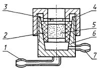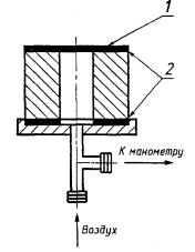 1 - патрубок для подвода воздуха; 2 - резиновое кольцо; 3 - металлическое кольцо; 4 - навинчивающаяся крышка; 5 - образец; 6 - патрон; 7 - патрубок для присоединения манометра Рисунок 3 5.2.3 Манометр для измерения перепада давления между двумя поверхностями испытуемого образца с погрешностью измерения не более 1 %. 5.2.4 Аппаратура для измерения скорости газового потока (расхода воздуха), состоящая из системы расходомеров (газомеров) с погрешностью измерения не более 2 %. При измерении проницаемости воздуха допускается скорость потока его определять вытеснением воды воздухом, используя газомер, представляющий градуированное устройство цилиндрической формы длиной 400 мм и диаметром 40 мм с ценой деления шкалы 1,0 см3 и хронометр (секундомер). 5.2.5 Штангенциркуль с нониусом по ГОСТ 166. 5.2.6 Щупы от 0,25 до 1,0 мм [1]. 5.2.7 Поверочный плоский угольник по ГОСТ 3749 или угломер с нониусом и точностью 5. 5.2.8. Барометр с погрешностью измерения не более 500 Па. 5.2.9 Секундомер [2]. 5.2.10 Сушильный шкаф с температурой сушки не менее 110 °С и точностью регулирования ± 5 °С. 5.2.11 Термометр для измерения температуры с ценой деления шкалы не более 0,5 °С. 5.2.12 Весы по ГОСТ 24104. 1 - промасленная калька или вакуумная резина; 2 - замазка Рисунок 4 6 Образцы для испытанияОбразцы для испытания должны быть цилиндрической формы диаметром (50 ± 0,5) мм или (36,0 ± 0,5) мм и высотой (50 ± 0,5) мм. Ось образца должна быть перпендикулярна его основаниям. Отклонение оси от перпендикулярности и отклонение от параллельности верхнего и нижнего оснований не должны превышать 0,5 мм. Отклонение от перпендикулярности контролируют с помощью щупа и угольника, прикладываемого к боковой поверхности образца в четырех местах. Отклонение от параллельности верхнего и нижнего оснований контролируют, измеряя высоту образца в четырех местах. Измерения при контроле перпендикулярности и параллельности проводят в точках пересечения двух взаимно перпендикулярных диаметров и боковой поверхности. Примечания 1 Допускается применять образцы: куб с длиной ребра 50 мм с допускаемыми отклонениями размеров ± 2 мм; прямой кирпич нормальных размеров 230 × 114 × 65 мм с допусками по нормативной документации; полый цилиндр длиной 50 - 100 мм, выпиленный перпендикулярно оси изделия. 2 Допускается определять коэффициент газопроницаемости на изделиях других форм и размеров (толщиной не менее 20 мм) или образцах из них, если это предусмотрено в нормативной документации. При переменном сечении изделия по направлению проходящего газа при расчете коэффициента газопроницаемости используют площадь среднего сечения. 6.2 Изготовление образцов Образец в форме цилиндра или куба высверливают или вырезают из изделия. Образец, на поверхности которого имеются трещины, пустоты или раковины, не испытывают. В отчете указывают направление изготовления образца, связанное с направлением прессования изделия. Поверхность испытуемого образца очищают от пыли жесткой щеткой. 6.3 Сушка образцов Перед испытанием образцы высушивают при температуре (110 ± 5) °С до постоянной массы. Массу считают постоянной, если после повторной сушки разность результатов взвешивания не превышает 0,1 %. Образцы, взятые для испытания непосредственно после обжига при разгрузке печей, можно не высушивать. Перед проведением измерения образцы после сушки охлаждают до комнатной температуры в эксик