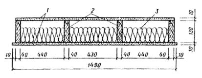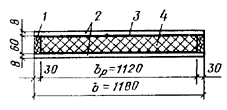 Рис. 1. Поперечное сечение плиты 1 – асбестоцементные листы УВ–75; 2 – утеплитель; 3 – бруски; 4 – асбестоцементный плоский лист Соединение обшивки с каркасом на шурупах диаметром 4 мм с шагом 250 мм. Плита свободно опирается по коротким сторонам. Расчетный пролет 3 м. Влажность воздуха внутри помещения 75 %, температура 17 °С. Определение напряжений в крайних ребрах каркаса и обшивке плиты А. Определение нагрузок Результаты определения нагрузок приведены в табл. 5. Величины кратковременных и длительных нагрузок приведены в табл. 6. Суммарная расчетная нагрузка на крайнее ребро плиты равна: