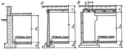 Рис. 25. Типы наружных стен подвалов а - из монолитного бетона; б - из вертикальных стеновых панелей; в - из горизонтальных стеновых панелей Марка бетона стыка должна быть не ниже марки бетона сопрягаемых элементов. Стены подвалов 10.35. Наружные стены подвалов могут выполняться из бетонных блоков, сборных железобетонных панелей, монолитного бетона и железобетона (рис. 25). Массивные подпорные стены из сборных блоков или монолитного бетона применяются при небольшой глубине подвала (до 3 м) и небольшой нагрузке (до 10 кПа) на прилегающей территории. Стены из вертикальных сборных железобетонных панелей, опертых на перекрытие, применяются в подвалах при значительных нагрузках на пол цеха, например в цехах заводов черной металлургии, и при большом заглублении подвалов. Стены из сборных железобетонных плит, располагаемых горизонтально и опирающихся на фундаменты колонн зданий, используют главным образом в многоэтажных промышленных зданиях каркасного типа.