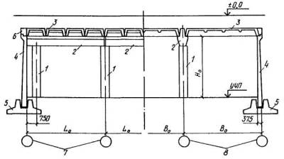 где Рg и Рq - интенсивность горизонтального давления грунта на глубине h0 от нормативных нагрузок. Предельный прогиб верха стены D не должен превышать величины h0/75. Горизонтальное перемещение верха стены, вызванное креном подошвы, определяется по формуле D = 5М0h/b2Е, (77а) где М0 - нормативный момент всех сил относительно центра тяжести подошвы стены; Е - модуль деформации грунта основания; h - высота стены; b - ширина подошвы фундамента (стена подвала). 7. РАСЧЕТ СТЕН ПОДВАЛОВ7.1. За расчетную схему конструкций подвалов принимается поперечная рама, состоящая из стен, колонн и опирающихся на них элементов перекрытия (рис. 12).
