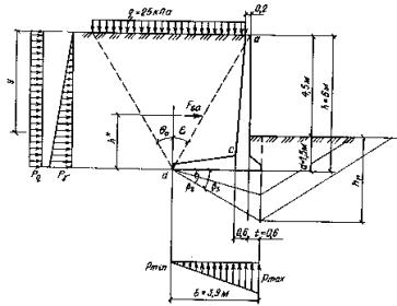 Рис. 10. Расчетная схема подпорной стены с анкерными тягами При е < b/6: для сечения 3-3