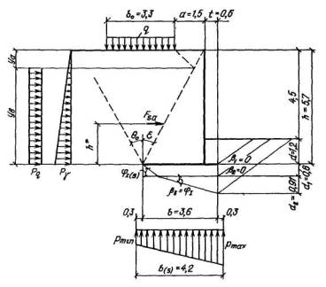 где gcI = 1,2; gc2 = 1,1 (по табл. 6); k = 1; Mg = 0,39; Mq = 2,57; Mc = 5,15 (по табл. 7 при gII = 17°); d = 1,8 м. Коэффициент горизонтального давления грунта l = 0,31 определяем по табл. 3 прил. 2 (при d = jII' = 32°; e = 28°). Интенсивность нормативного давления грунта на стену (при y = 5,7 м): Pg = [gII'gfhl - cII'(k1 + k2)]y/h = [20,9×1×5,7×0,31 - 0]5,7/5,7 = 36,93 кПа; Pq = qgf l/(1 + 2tgqoya/bo) = 27,44×1×0,31/(1 + 2tg30°×1,35/3,3) = 5,78 кПа; Fsa, g = 36,93×5,7/2 = 105,25 кН; Fsa, q = 5,78×44,35 = 25,14 кН; Fsa = Fsa, g + Fsa, q = 105,25 + 25,14 = 130,39 кН; h* = [105,25×5,7/3 +25,14(5,7 - 1,35 - 4,35/2)]/130,39 = 1,95 м; M0 = 130,39[1,95 - tg(28° + 30°) (3,6 / 2 - 1,95 tg 28°)] + 20,9 × 1(3,6 - 0,6)× ×[5,7(3,6 - 4×0,6) + + 6×0,6×1,2]/12 = 153,36 кН×м; Fu = Fsatg(e + jI') + gI'gf[h(b - t)/2 + td] + bsd1gI(s) = 130,39tg(28° + 30°) 20,9×1[5,7(3,6 - 0,6)/2 + +0,6×1,2] + 4,2×0,6×21 = 455.32 кН; e = 153,36/455,32 = 0,34 м;