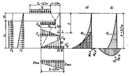 Рис. 5. Расчетная схема уголковой подпорной стены а) - эпюры изгибающих моментов; б) - эпюры поперечных сил Требуется проверить габаритные размеры принятой конструктивной схемы и определить изгибающие моменты и поперечные силы в сечениях сборных железобетонных элементов и усилие в тяге. Определяем интенсивность бокового давления грунта на 1 м стены. Угол наклона плоскости обрушения засыпки к вертикали:
