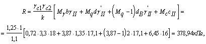 где gс1 = 1,25; gс2 = 1 (по табл. 6); k = 1 (по п. 6.15); Мg = 0,84; Мq = 4,37; Мс = 6,9 (по табл. 7 при jII = 26°); d = 1,5 м. Угол наклона плоскости обрушения к вертикали