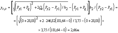 Условный угол плоскости обрушения грунта принимаем: tg e = 3/5,7 = 0,526; e = 27°48¢ » 28°. По табл. 3 прил. 2 (при d = j¢I = 30°; r = 0°; e = 28°) l = 0,33. Эквивалентную распределенную полосовую нагрузку на поверхности засыпки от гусеничной нагрузки НГ-60 определяем по формуле (13) q = 90/(2,5 + ya tgq0) = 90/(2,5 + 1,35 tg 30°) = 27,44 кПа. Расстояние по вертикали от поверхности грунта засыпки до границ распределения условной эквивалентной боковой нагрузки определяем по формуле уа = а/(tg q0 + tg e) = 1,5/(tg 30°+ tg28°) = 1,35 м. Протяжность эпюры давления определяем по формуле уb = (b0 + 2tg q0ух)/(tg e + tg q0) = (3,3 + 2tg30°×1,35)/(tg 28°+ tg30°) = 4,38 м. В соответствии с п. 5.7б принимаем: yb = h - ya = 5,7 - 1,35 = 4,35 м. Интенсивность горизонтального давления грунта на глубине у = 5,7 м, определяем по формуле (1)