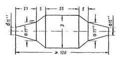 4.3.16. Сварку арматуры разных классов между собой следует выполнять при параметрах режима, определенных в соответствии с требованиями настоящих РТМ для арматуры более высокого класса. 4.3.17. Сварку стержней разных диаметров (с соотношением d'н/dн от 0,35 до 0,85) следует выполнять на машинах типов МСО-604, МСО-201 (МС-2008, МСМУ-150 и MC-1602), оборудованных специальным приспособлением*, позволяющим осуществлять независимый подогрев толстого стержня. Подогрев толстого стержня осуществляется в режиме сопротивления путем замыкания на медную кулису-перемычку (приложение 10). * Приспособление разработано ЭКБ ЦНИИСК им.Кучеренко. 109428, Москва, 2-я Институтская, 6 ("Устройство к машине контактной стыковой сварки" 2164/1Д и 2164/2Д соответственно к машинам ручного и автоматического действия. При сварке стержней разного диаметра геометрические параметры режима принимаются по табл.4.7 для тонкого стержня, за исключением величины ly толстого стержня, которую следует устанавливать максимально возможной для имеющегося оборудования. 4.3.18. Для сварки стержней разных диаметров необходимо разогреть конец толстого стержня до светло-красного каления, предварительно закрыв конец тонкого стержня перемычкой. Затем при включенном токе отвести на 2-3 мм подвижную плиту с толстым стержнем, убрать перемычку и произвести сварку в соответствии с указаниями п.4.3.13 и п.4.3.14. 4.3.19. Соединения стержней, рассчитанные на эксплуатацию при вибрационной нагрузке (тип С3-Км, рис.4.9), после сварки должны быть подвергнуты механической обработке путем обрубки грата и последующей обточки наждачным кругом средней зернистости (№ 36-46). Обточку наждачным кругом надлежит вести в продольном относительно оси стержней направлении на минимальную глубину до получения блестящей поверхности. При обточке должны быть соблюдены размеры, приведенные в табл.4.6, и плавные переходы от поверхности стержней к месту утолщения стыка. Обработанная наждачным кругом поверхность не должна иметь поперечных и глубоких продольных рисок и черноты в месте перехода от утолщения стыка к внутреннему диаметру стержня. Недопустимо появление на обрабатываемых поверхностях цветов побежалости. Соединения стержней, также рассчитанные на эксплуатацию при вибрационной нагрузке, типа С4-Кп (рис.4.9 и табл.4.6),отличаются от приведенных выше тем, что концы стержней, если это возможно, предварительно перед сваркой протачиваются на токарном станке, затем свариваются методом оплавления или оплавления с подогревом без последующей механической обработки сварного соединения. 4.3.20. Контактная стыковая сварка "несвариваемой" стержневой арматуры класса A-IV марки 80С, Ат-V и Ат-VI, а также канатов К-7 и K-19 возможна с применением специальных технологических приемов с помощью гильз-накладок, надетых до сварки на концы арматуры или канатов и затем опрессованных. 4.3.21. Электроды контактной стыковой машины для сварки с применением дополнительных гильз-накладок должны иметь призматические гнезда, размеры которых подбирают по наружному диаметру гильзы (рис.4.12).