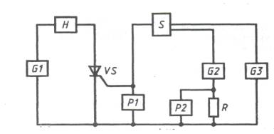 G1 - источник питания основной цепи; H - сигнальное устройство; Р1 - измеритель напряжения; Р2 - измеритель напряжения; S - коммутационное устройство; G2 - генератор импульсного запирающего тока управляющего электрода; G3 - генератор импульсного отпирающего тока управляющего электрода; R - резистор; VS - испытуемый тиристор Черт - 1 2.3. Основные элементы схемы измерения должны удовлетворять следующим требованиям. Источник питания (G1 должен обеспечивать в соответствии с требованиями п. 2.1 заданное значение основного прямого тока с погрешностью в пределах ±10 % и основного прямого напряжения с погрешностью в пределах ±5 %. Постоянная времени основной цепи не должна быть более 0,2 tу выкл. Время выключения по управляющему электроду tу.выкл. указывают в стандартах или другой технической документации, утвержденной в установленном порядке, на тиристоры конкретных типов. За время срабатывания сигнального устройства амплитуда тока Iузи не должна изменяться более чем на +5 %. Генератор G2 должен обеспечить заданную частоту следования и длительность импульсов тока, которые указывают в стандартах или другой технической документации, утвержденной в установленном порядке, на тиристоры конкретных типов. Погрешность задания длительности импульсов должна быть в пределах ±10 %, спад плоской вершины - не более 10 %. Выходное сопротивление генератора импульсного запирающего тока управляющего электрода Rвых.G2 в течение времени, равного времени запаздывания испытуемого тиристора tзп, должно удовлетворять условию