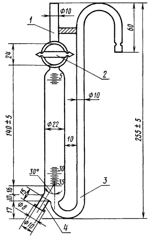 Дата введения 01.07.77 Настоящий стандарт распространяется на автомобильные бензины и устанавливает метод оценки склонности бензинов к образованию паровых пробок в системе топливоподачи карбюраторных двигателей. Сущность метода заключается в испытании бензинов на лабораторной установке с последующей оценкой склонности к образованию паровых пробок по величине фазового соотношения пар - жидкость при заданных температурах нагрева. Метод предназначен для квалификационных испытаний и научно-исследовательских целей. 1. АППАРАТУРА, РЕАКТИВЫ И МАТЕРИАЛЫ1.1. При проведении испытаний применяют: ультратермостат, обеспечивающий нагрев с погрешностью не более 0,1 °С; бюретку паровую градуированную, вместимостью 35 см3 с ценой деления шкалы 0,5 см3 (черт. 1); склянку уравнительную вместимостью 250 - 300 см3; сосуд стеклянный цилиндрический диаметром 160 мм и высотой 250 мм; воронку стеклянную по ГОСТ 25336, типа 1а; колбу коническую по ГОСТ 25336, вместимостью 10 см3; шприц медицинский вместимостью 1 - 2 см3 с набором игл; бюретку 6-2-5 по ГОСТ 29251; сосуд Дьюара цилиндрический внутренним диаметром не менее 40 мм и глубиной 200 мм; баню охлаждающую водо-ледяную или холодильник; трубку с хлористым кальцием; грушу резиновую № 3; термометр ртутный электроконтактный по ГОСТ 9871, типа ТПК-4-П-200; термометр ртутный контрольный по ГОСТ 28498; термометр ртутный стеклянный по ГОСТ 28498, ТЛ-5, типа 2; барометр-анероид метеорологический; линейку измерительную с пределами шкалы 0 - 500 мм; штативы лабораторные; трубку резиновую наружным диаметром 14 мм и внутренним диаметром 10 мм; трубку резиновую наружным диаметром 12 мм и внутренним диаметром 8 мм; трубки стеклянные наружным диаметром 4 - 4,5 и 8 мм; глицерин обезвоженный по ГОСТ 6259; кальций хлористый; ацетон по ГОСТ 2603; воду дистиллированную по ГОСТ 6709; Паровая бюретка 1 - верхний отвод; 2 - запорный краник с отверстием 2 мм; 3 - донный отвод; 4 - нижний боковой отвод Черт. 1 коллодий медицинский и полиграфический; цапонлак; жидкость смазочная М-1. (Измененная редакция, Изм. № 1). 2. ПОДГОТОВКА К ИСПЫТАНИЮ2.1. Для проведения испытаний пробы автомобильных бензинов отбирают по ГОСТ 2517. После отбора проб бутылки плотно закрывают корковыми пробками, которые заливают коллодием или цапонлаком и хранят в лабораторных условиях при температуре не выше 20 °С не более 45 сут. 2.2. Калибровку паровой бюретки и шприца проводят при помощи микробюретки. 2.3. Собирают лабораторную установку по схеме, указанной на черт. 2. 2.3.1. Устанавливают в ультратермостат электроконтактный и контрольный термометры и подсоединяют его резиновыми трубками к водопроводной сети и стоку в канализацию. 2.3.2. Нагнетающий и отсасывающий штуцеры ультратермостата соединяют резиновыми трубками с водяной баней. При этом резиновую трубку нагнетающего штуцера укладывают полукольцом на дне сосуда, а резиновую трубку отсасывающего штуцера опускают в водяную баню на 0,25 - 0,3 ее высоты. 2.3.3. Соединяют резиновыми трубками уравнительную склянку, паровую бюретку и влагопоглощающую трубку. 1 - ультратермостат; 2 - вход и выход воды; 3 - термометр контрольный по ГОСТ 28498; 4 - термометр электроконтактный; 5 - насос циркуляционный; 6 - трубки резиновые; 7 - баня стеклянная водяная; 8 - термометр по ГОСТ 28498; 9 - бюретка паровая; 10 - склянка уравнительная; 11 - трубка хлоркальциевая; 12 - штативы лабораторные Черт. 2 2.4. Наполняют бач