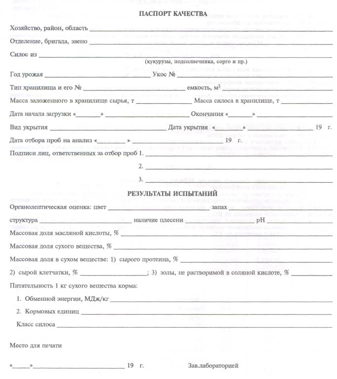 Примечания: 1.В силосе, приготовленном из провяленных трав, рН при определении класса не учитывают. 2. В силосе, приготовленном с применением пиросульфита натрия, рН не определяют. 3.В силосе, законсервированном пиросульфитом натрия, пропионовой кислотой и ее смесями с другими кислотами массовую долю масляной кислоты не определяют. 1.2.9. Силос из зеленых растений бурого или темно-коричневого цвета с сильным запахом меда или свежеиспеченного ржаного хлеба, независимо от других показателей качества относят к неклассному. Скармливание животным такого силоса допускается по заключению ветеринарной службы. 1.2.10. Содержание в силосе нитритов и нитратов, токсичных элементов и остаточных количеств пестицидов не должно превышать максимально допустимого уровня, утвержденного Главным ветеринарным управлением СССР. 2. ПРИЕМКА2.1. Силос принимают партиями. Партией считают любое количество однородного по составу силоса, заложенного в одно хранилище. На каждую партию оформляют документ о качестве с указанием вида силоса и результатов испытаний по показателям, установленным настоящим стандартом (см. приложение 2). 2.2. При возникновении разногласий в оценке качества силоса проводят повторно отбор проб и испытание. Результаты повторных испытаний распространяют на всю партию. 3. МЕТОДЫ ИСПЫТАНИЙ3.1. Отбор проб - по ГОСТ 27262. 3.2. Определение структуры Структуру силоса определяют визуально при хорошем освещении осмотром точечных проб или объединенной пробы. 3.3. Определение запаха Запах силоса определяют органолептически, растирая небольшую его порцию между пальцами. 3.4. Подготовка проб для анализа и определение массовой доли масляной кислоты - по ГОСТ 23637. 3.5. Определение массовой доли сухого вещества - по ГОСТ 27548. 3.6. Определение массовой доли сырого протеина - по ГОСТ 13496.14. 3.7. Определение массовой доли сырой клетчатки - по ГОСТ 13496.2. 3.8. Определение массовой доли золы, не растворимой в соляной кислоте, - по ГОСТ 13496.14. 3.9. Определение рН силоса - по ГОСТ 26180 3.10. Определение массовой доли органических кислот - по ГОСТ 23637 со следующим дополнением. Приготовляют раствор двухромовокислого калия. Для этого К остатку жидкости в отгонной колбе после отгона дистиллятов 1 и 2 добавляют 55 см3 двухромовокислого калия для окисления молочной кислоты в уксусную (следует не допускать попадания двухромовокислого калия на шкафы) и 100 см3 воды. Жидкость в колбе нагревают до кипения и отгоняют 50 см3 дистиллята в течение 10-15 мин. Далее испытание продолжают по ГОСТ 23637. Массовую долю уксусной (X), масляной (Х1) и молочной (Х2) кислот в корме в процентах вычисляют по формулам: X = 0,096V2 - 0,021V1; Х1 = 0,043V1 - 0,068V2; Х2 = 0,123V3 - 0,046V2 + 0,006V1, где V1, V2 и V3 - количество 0,05 н. щелочи, израсходованной на титрование дистиллятов. За окончательный результат испытания принимают среднее арифметическое результатов двух параллельных определений. Допустимые отклонения между результатами двух параллельных определений не должны превышать 0,03 %. 3.11. Содержание нитритов, токсичных элементов и остаточных количеств пестицидов определяют по методикам и в соответствии с порядком, утвержденным Главным ветеринарным управлением СССР. 3.12. Определение содержания нитратов - по ГОСТ 13496.19. 4. ХРАНЕНИЕ4.1. Силос хранят в траншеях и башнях без доступа воздуха в соответствии с правилами, утвержденными в установленном порядке. ПРИЛО