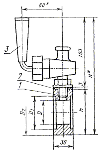 Дата введения 01.07.81 (Измененная редакция, Изм. № 2). Несоблюдение стандарта преследуется по закону 1. Настоящий стандарт распространяется на воздушники, применяемые для спуска воздуха из стеклянных трубопроводов. Требования настоящего стандарта являются обязательными. (Измененная редакция, Изм. № 2). 2. Конструкция и основные размеры воздушников должны соответствовать указанным на черт. 1 и в табл. 1. 1 - корпус; 2 - прокладка; 3 - кран Dy 10, исполнение 2 ГОСТ 22595-77 Черт. 1 * Размеры для справок. Таблица 1 Размеры в мм