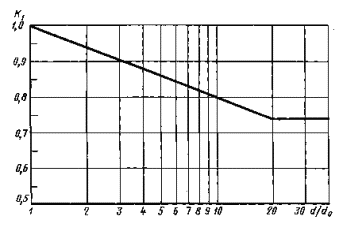 1.2. Определение эффективных коэффициентов концентрации напряжений Кσ, Кτ и отношений Kσ/Kdσ, Kτ/Kdτ1.2.1. Коэффициенты Кσ, Кτ и отношения Kσ/Kdσ, Kτ/Kdτ определяют по экспериментальным данным или путем расчета. 1.2.2. Определение Кσ , Кτ, Kσ/Kdσ и Kτ/Kdτ - по экспериментальным данным. Коэффициенты Кσ, Кτ могут определяться экспериментально на геометрически подобных образцах диаметром d или толщиной h поперечного сечения не менее 40 мм, если d или h рассчитываемой детали превышают это значение. Если d или h рассчитываемой детали меньше 40 мм, то при экспериментальном определении Кσ, Кτ целесообразно вести испытания на натурных деталях или моделях тех же поперечных размеров. Для ряда деталей экспериментально полученные значения Кσ, Кτ и Kσ/Kdσ, Kτ/Kdτ приведены в приложении 2 (черт. 1-7, 13-16). Значения (Kσ/Kdσ)0 для валов с напрессованными деталями (при наличии коррозии трения) при изгибе представлены на черт. 1 приложения 2. При σB > 500 МПа и ρ < 30 МПа следует учитывать соответствующие поправочные