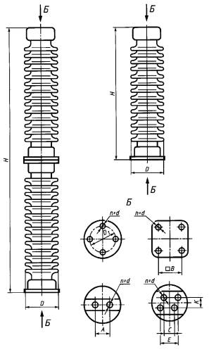 Примечание. В скобках приведены присоединительные размеры для изоляторов, используемых при комплектовании колонок на более высокие классы напряжений. Пример условного обозначения изолятора керамического опорного стержневого на номинальное напряжение 35 кВ, с минимальной механической силой на изгиб 500 даН, конструктивного исполнения 01, климатического исполнения УХЛ, категории размещения 1: Изолятор ИОС-35-500-01 УХЛ 1 ГОСТ 25073-81 (Измененная редакция, Изм. № 2-5). 3. Значения массы изоляторов приведены в приложении 2. Размеры в мм