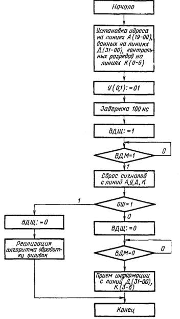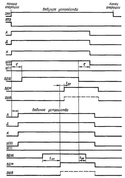 tрл - время распространения сигналов по линиям магистрали от УСТПО до УВК; tПТЗ - время ожидания УВК сброса сигнала ПТЗ с момента прихода ЗПР; tзу - задержка сигнала УСТПО при передаче сигнала РЗР последующему устройству; п - число устройств, через которые проходит сигнал РЗР до устройства, выставившего сигнал ЗПР Черт. 5 2.3.3. Обмен информацией по магистрали начинается в момент установки сигнала на линии ЗАН и состоит из одной или нескольких операций передачи данных. Операция передачи данных продолжается с момента установки ведущим устройством сигнала на линии ВДЩ или ПРЕР до сброса ведомым устройством сигнала на линии ВДМ. На магистрали установлены четыре типа операций передачи данных: «Чтение данных»; «Запись данных»; «Запись - чтение данных»; «Прерывание». При передаче информации по магистрали возможен разброс во времени прихода сигналов в устройство по различным линиям, даже если они были переданы одновременно. В связи с этим сигнал на линии ВДЩ (признак достоверности информации) устанавливается (сбрасывается) с временной задержкой t = 100 нс относительно информации, которую он сопровождает. 2.3.4. При выполнении операции «Чтение данных» осуществляется передача данных от ведомого устройства ведущему, при этом сигналы по магистрали передаются в последовательности, показанной на черт. 6: - ведущее устройство ожидает сброса сигнала на линии ВДМ, установленного в предыдущей операции обмена; - ведущее устройство устанавливает адрес ведомого устройства по линии А (19-00) код, соответствующий операции «Чтение данных» на линии У (0, 1), контрольные разряды на линии К (0-2); - через t = 100 нс ведущее устройство устанавливает сигнал на линию ВДЩ; - ведомое устройство, обнаружившее сигнал на линии ВДЩ и опознавшее свой адрес на линиях А (19-00), осуществляет подготовку данных и формирование необходимых признаков для передачи их ведущему устройству. После завершения подготовки информации ведомое устройство устанавливает данные на линии Д (31-00), контрольную информацию на линии К (3-6), сигнал на линию ОШВ, если в процессе обмена ведомым устройством была обнаружена ошибка по четности в принимаемом адресе, и сигнал на линию ВДМ; - при получении сигнала по линии ВДМ ведущее устройство осуществляет прием информации с линий Д (31-00), К (3-6), ОШВ и осуществляет сброс сигнала на линии ВДЩ; - через t = 100 нс ведущее устройство прекращает выдачу сигналов на линии А (19-00), У (0, 1) и К (0-2); - при обнаружении сброса сигнала на линии ВДЩ ведомое устройство прекращает выдачу сигналов по линиям Д (31-00), К (3-6), ОШВ и ВДМ. tрл - время распространения сигнала по линиям магистрали между ведущим и ведомым устройствами; tчт - время чтения Черт. 6 При выполнении операции «Запись данных» осуществляется передача данных от ведущего устройства ведомому, при этом сигналы по магистрали передаются в последовательности, показанной на черт. 7: - ведущее устройство ожидает сброса сигнала ВДМ, установленного в предыдущей операции обмена; - ведущее устройство устанавливает: адрес ведомого устройства на линии А (19-00); код, соответствующий операции «Запись данных» на линии У (0, 1); данные, передаваемые ведомому устройству на линии Д (31-00); контрольные разряды на линии К (0-6); - через t = 100 нс ведущее устройство устанавливает сигнал на линию ВДЩ; - ведомое устройство, опознавшее свой адрес и обнаружившее сигналы на л