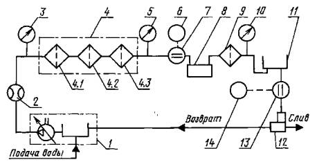 1 - блок подачи; 2 - расходомер; 3, 5 и 10 - манометры; 4 - блок фильтров; 4.1 и 4.2 - ионообменные фильтры; 4.3 - фильтр предварительной очистки от микрочастиц; 6 и 14 - приборы для измерения удельного сопротивления воды; 7 и 13 - датчики удельного сопротивления воды; 8 - блок ультрафиолетовой стерилизации; 9 - фильтр тонкой очистки от микрочастиц; - потребитель; 12 - блок возврата Примечание. При отсутствии требований к содержанию в деионизованной воде микроорганизмов и микрочастиц из схемы установки следует исключить поз. 8-10. 5. Установка должна обеспечивать получение деионизованной воды с параметрами, указанными ниже: