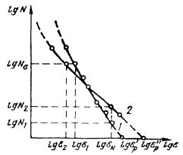 N1 и N2 - усталостная выносливость для резин 1 и 2, соответствующая заданной максимальной деформации цикла eN; e1 и e2 - максимальные деформации цикла для резин 1 и 2, соответствующие усталостной выносливости Ne; e¢p, e²p - деформации, соответствующие однократному нагружению (N = 1) для резин 1 и 2 (полученные экстраполяцией кривых на значение lgN = 0) При построении такого графика находят значение механического параметра, соответствующего однократному нагружению. Для этого используют метод утомления при больших деформациях и экстраполяции значений N к lgN = 0. При необходимости определения показателей усталостной прочности или усталостной выносливости за пределами экспериментальной зависимости в области небольших деформаций допускается экстраполировать прямые не более, чем на один-полтора десятичных порядка. Графические или табличные зависимости lgN - lge, lgN - lgf и lgN - lgW являются основной исходной характеристикой усталостных свойств резин. 4.4. Значение усталостной прочности или усталостной выносливости, определенное при заданном числе циклов и заданном параметре механического нагружения, недостаточно для характеристики усталостных свойств материала. При феноменологическом рассмотрении собственные усталостные свойства резин характеризуются коэффициентами уравнений, описывающих зависимость усталостной прочности от числа циклов нагружения до разрушения и усталостной выносливости от параметров механического нагружения. Виды кривых усталостной выносливости, методы их описания и характеристика факторов усталости приведены в справочном приложении 2. 4.5. Для характеристики логарифмических зависимостей усталостной выносливости определяют коэффициенты усталостной выносливости be, bf, bW из уравнений: