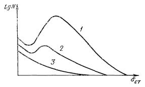ПРИЛОЖЕНИЕ 2Справочное ЗАВИСИМОСТЬ ПОКАЗАТЕЛЕЙ УСТАЛОСТНЫХ СВОЙСТВ ОТ УСЛОВИЙ ИСПЫТАНИЯ И СОСТАВА РЕЗИН1. Влияние механического параметра нагружения Усталость заключается в необратимом изменении структуры и свойств материала и в конечном счете нарушении целостности образца. Усталостные явления есть результат утомления - процесса воздействия на материал в течение определенного времени и в заданных условиях механических напряжений и деформаций, а также других сопутствующих немеханических факторов, таких как тепло, свет, кислород и озон воздуха, ускоряющих усталостное разрушение. Усталостная выносливость, определяемая числом циклов до разрушения образца N, снижается с увеличением циклической деформации e, напряжения f и удельной энергии деформации W. Зависимости N от e, f и W, имеющие вид кривых типа Велера, удобно представлять в логарифмических координатах lgN - (lge, lgf, lgW). На черт. 1 показаны типичные зависимости lgN - lgW, сходный вид имеют зависимости N и от других параметров механического нагружения. Зависимость усталостной выносливости от удельной энергии деформации для резин разного типа 1 - резины на основе химически нестойких эластомеров; 2 - резины с повышенной химической стойкостью, у которых в определенной области изменения N не наблюдается наступление условного предела усталости; 3 - эластомеры с повышенной химической стойкостью, у которых наблюдается быстрое наступление условного предела усталости Черт. 1 Для резин на основе комбинации эластомеров, кривые усталостной выносливости в логарифмических координатах могут иметь S-образную форму. Если утомлению при циклических деформациях подвергаются предварительно статически растянутые образцы, то зависимости N от статической деформации eст имеют вид, показанный на черт 2. Зависимость усталостной выносливости от статической деформации для резин различного типа 1 - высокопрочные эластомеры, кристаллизующиеся при растяжении; 2 - высокопрочные наполненные некристаллизующиеся резины, например, из бутадиен-стирольного каучука; 3 - малопрочные ненаполненные резины Черт. 2 Немонотонные зависимости N от eст объясняются ориентационным и кристаллизационным упрочнением резин при их статическом растяжении. Ориентация материала вдоль направления циклического растяжения уменьшает скорость его разрушения. Зависимости усталостной выносливости от параметров механического воздействия предпочтительно представлять в координатах lgN - lgW. Это объясняется тем, что энергия деформации является таким параметром, который характеризует как величину внешнего воздействия, так и отклика материала на это воздействие. Энергия деформации является наиболее точным критерием усталостной выносливости для материалов с нелинейной зависимостью напряжения от деформации f(e) и при утомлении в условиях сложно-напряженного состояния. Для нелинейных кривых f(e) зависимости lgN(lgW) могут быть линейные, при этом зависимости lgN(lgf) и lgN(lge) будут всегда нелинейные. Зависимости усталостной прочности или усталостной выносливости от значений параметров утомления можно описать степенными уравнениями следующего вида: