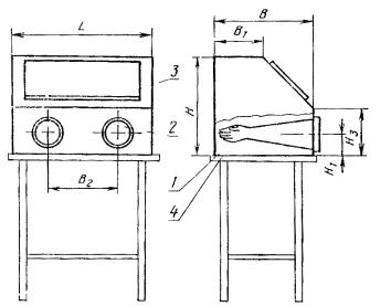 1 - корпус; 2 - перчатки; 3 - окно; 4 - столешница. Черт. 6 Защитный бокс 7БП1 1 - корпус; 2 - перчатки; 3 - окно; 4 - столешница. Черт. 7 Таблица 1