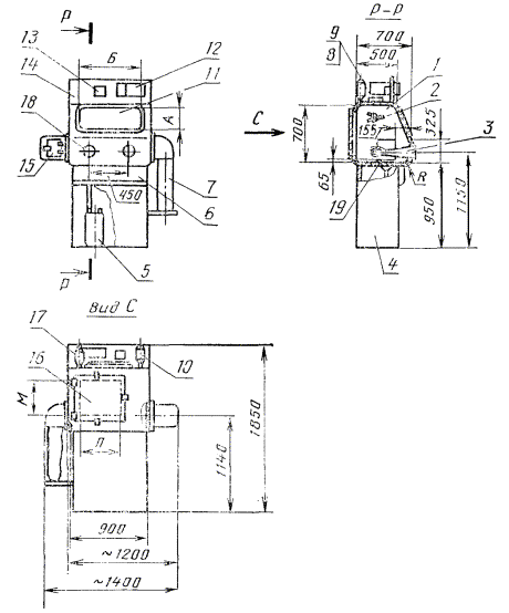 1 - корпус; 2 - душевик-распылитель; 3 - перчатки; 4 - подставка; 5 - сборник жидких отходов; 6 - вентильная панель; 7 - заглушка люка; 8, 10 - окно по ГОСТ 23410; 9 - светильник; 11 - пульт управления; 12 - тягонапоромер; 13 - панель приборов; 14 - монтажная дверь; 15 - фильтр вытяжной; 16 - фильтр приточный; 17 - дверка люка; 18 - обойма; 19 - 2 люка; 20 - люк для транспортера (К×Л) Черт. 9 Защитный бокс 3БП2-нж