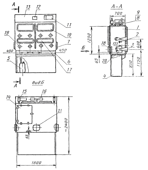 1 - корпус; 2 - душевик-распылитель; 3 - перчатки; 4 - подставка; 5 - сборник жидких отходов; 6 - вентильная панель; 7 - заглушка люка; 8, 10, 17 - окно по ГОСТ 23410; 9 - светильник; 11 - пульт управления; 12 - тягонапоромер; 13 - панель приборов; 14 - монтажная дверь; 15 - фильтр вытяжной; 16 - фильтр приточный; 18 - дверка люка; 19 - обойма; 20 - 2 люка; 21 - люк для транспортера Черт. 10 Защитный бокс 4БП2-нж