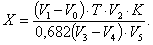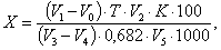 где V1 - объем рабочего раствора реактива Фишера, израсходованный на титрование рабочей пробы, см3; V0 - объем рабочего раствора реактива Фишера, израсходованный на титрование контрольной пробы, см3; Т - титр реактива Фишера по воде, мг/см3; V2 - объем мерной колбы, используемой для приготовления анализируемого раствора, см3; К - коэффициент испарения (ГОСТ 28326.1, приложение); V3 - суммарный объем жидкого аммиака и этиленгликоля, см3; V4 - объем этиленгликоля, см3; 0,682 - плотность жидкого аммиака, г/см3; V5 - объем анализируемого раствора, отобранный в колбу для титрования, см3. После преобразования формула примет вид