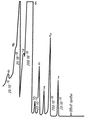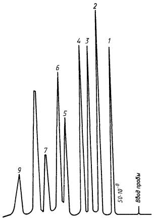 4.8. Типовые хроматограммы синтетической смеси пиридиновых продуктов, 2-пиколина, 3-пиколина, 4-пиколина, бета-пиколиновой фракции, очищенного пиридина и пиридина-растворителя - приведены на черт. 1 - 7. Типовая хроматограмма синтетической смеси пиридиновых продуктов 1 - н-нонан; 2 - пиридин; 3 - 2-пиколин; 4 - 2,6-лутидин; 5 - 3-пиколин; 6 - 4-пиколин; 7 - 2,5-лутидин; 8 - 2,4-лутидин; 9 - 2,4,6-коллидин Черт. 1 Типовая хроматограмма чистого 2-пиколииа (альфа-пиколина)