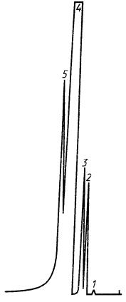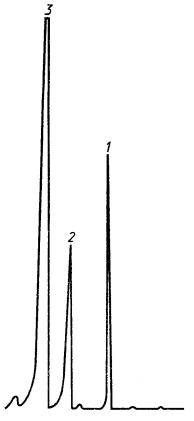 1 - неидентифицированный компонент; 2 - неидентифицированный компонент; 3 - н-нонан; 4 - пиридин; 5 - 2-пиколин Черт. 6 Типовая хроматограмма пиридина-растворителя 1 - н-нонан; 2 - пиридин; 3 - 2-пиколин Черт. 7 5. ОБРАБОТКА РЕЗУЛЬТАТОВ5.1. Определение состава чистых пиридиновых продуктов - 2-пиколина, 3-пиколина, 4-пиколина, очищенного пиридина. 5.1.1. Для определения состава чистых пиридиновых продуктов по полученным хроматограммам находят площади пиков всех примесей. Площадь пика каждой примеси продукта (Si) в квадратных миллиметрах вычисляют по формуле Si = h × b × М, (1) где h - высота пика, мм; b - ширина пика, измеренная на середине его высоты, мм; М - коэффициент деления выходного сигнала пика. Для определения площадей пиков допускается использование электронных интеграторов, а также любой другой вычислительной техники. 5.1.2. Массовую долю каждой примеси (Xi) в процентах вычисляют по формуле где Ki - относительный градуировочный коэффициент определяемого компонента; mн - масса внутреннего эталона (н-нонана) в пробе, г; тп - масса пробы анализируемого продукта, г; Si - площадь пика определяемого компонента, мм2; Sн - площадь пика н-нонана, мм2. 5.1.3. Массовую долю основного вещества (X) в процентах вычисляют по формуле Х = 100 - SXi, (3) где SXi - сумма массовых долей всех примесей анализируемого продукта, %. 5.2. Определение состава технических продуктов - бета-пиколиновой фракции и пиридина-растворителя. 5.2.1. При определении состава технических продуктов методом внутреннего эталона расчет ведется по формуле (2). 5.2.2. При полном анализе возможно применение для расчетов хроматографических пиков метода внутренней нормализации. Массовую долю каждого компонента (Xi) в процентах вычисляют по формуле