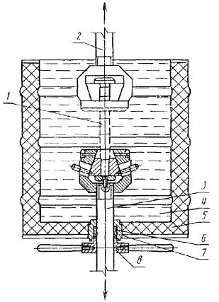 Черт. 18 ПРИЛОЖЕНИЕ 3Рекомендуемое Схема размещения образцов в герметизируемом криостате 1 - испытуемый образец; 2 - криостат; 3 - захват; 4 - датчик уровня охладителя; 5 - герметизирующая гайка Черт. 19 Схема размещения образцов в негерметизируемом криостате 1 - испытуемый образец; 2 - верхняя тяга (удлинительная штанга); 3 - нижняя тяга; 4 - охлаждающая жидкость; 5 - теплоизоляция; 6 - набивка (парафинированный графит с асбестом); 7 - кожух криостата; 8 - гайка-заглушка Черт. 20 ПРИЛОЖЕНИЕ 4Рекомендуемое ПОРЯДОК СТАТИСТИЧЕСКОЙ ОБРАБОТКИ РЕЗУЛЬТАТОВ ИСПЫТАНИЙ1. Для статистической обработки результатов испытаний составляют вариационный ряд характеристик σ или τ. Временное сопротивление при растяжении (σ), МПа (кгс/мм2), вычисляют по формуле