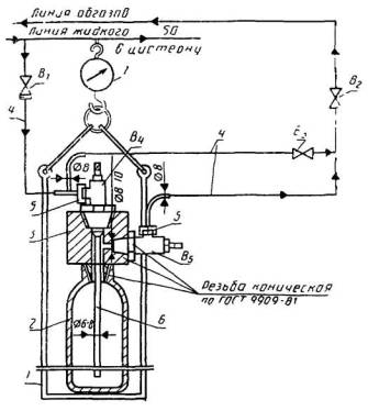 1 - корзина подвески баллона к динамометру; 2 - баллон; 3 - насадка для баллона; 4 - трубка для подсоединения баллона к линии жидкого сернистого ангидрида и линии абгазов; 5 - накидные гайки; 6 - сифон; 7 - динамометр; В1 и В4 - вентили для жидкого сернистого ангидрида; В2 и В5- абгазные вентили; В3 - вентиль для эвакуации сернистого ангидрида из линии жидкого сернистого ангидрида Черт. 2 бюретки, пипетки по ГОСТ 20292-74 2-го класса точности; весы лабораторные общего назначения по ГОСТ 24104-88 2-го класса точности с наибольшим пределом взвешивания 200 г и 4-го класса точности с наибольшим пределом взвешивания 500 г; набор гирь по ГОСТ 7328-82. Допускается применение аналогичной лабораторной посуды по классу точности не ниже указанной в стандарте. Пункт 4.2 дополнить абзацем: «Метод основан на испарении пробы жидкого сернистого ангидрида и взвешивании нелетучего остатка». Пункт 4.2.1. Первый, второй абзацы исключить; третий абзац. Исключить ссылку: ГОСТ 215-73. Пункт 4.2.2. Первый абзац. Заменить слова: «взвешенную с погрешностью не более 0,0002 г» на «предварительно взвешенную (результат взвешивания в граммах записывают с точностью до четвертого десятичного знака)». второй абзац. Заменить слова: «с той же погрешностью» на «(результат взвешивания в граммах записывают с точностью до четвертого десятичного знака)». Пункт 4.2.3. Последний абзац исключить. Пункт 4.3 дополнить абзацем: «Метод основан на восстановлении мышьяка до мышьяковистого водорода, который улавливают бумагой, пропитанной раствором бромида ртути». Пункт 4.3.1. Второй абзац. Исключить слова «по ГОСТ 36-78»; второй, восьмой абзацы. Заменить ссылку: ГОСТ 4517-75 на ГОСТ 4517-87; пятый абзац дополнить словами: «или парафины для лабораторных целей»; шестой абзац изложить в новой редакции: «Цинк гранулированный»; седьмой, одиннадцатый, двенадцатый абзацы исключить. Пункт 4.3.2. Последний абзац дополнить словами: «что соответствует содержанию мышьяка (As) в жидком сернистом ангидриде 0,000004 %». Пункт 4.4. дополнить абзацем: «Метод основан на взаимодействии воды, находящейся в среде метанола, в присутствии оснований (пиридина или уксуснокислого натрия) с сернистым ангидридом и металлическим йодом с образованием солей йодистоводородной и серной кислот. Эквивалентную точку определяют визуально по появлению окраски непрореагировавшего йода». Пункт 4.4.1. Первый, последний абзацы исключить; второй абзац дополнить словами: «или диоксана»; четвертый абзац. Заменить слова: «с погрешностью не более 0,0002 г» на «(результат взвешивания в граммах записывают с точностью до четвертого десятичного знака)». Пункт 4.4.2. Первый абзац. Заменить значение 500 см3 на 300-500 см3. Пункт 5.1. Первый абзац изложить в новой редакции: «Жидкий сернистый ангидрид заливают в стальные баллоны по ГОСТ 949-73 объемом от 20 до 50 дм3 под давлением 0,6 МПа (6 кгс/см2) или в специальные контейнеры-бочки вместимостью 800-1000 дм3 для жидкого хлора, или в специальные железнодорожные цистерны, принадлежащие предприятию-изготовителю, рассчитанные на давление не менее 1,5 МПа (15 кгс/см2)»; второй абзац исключить. Пункты 5.3, 5.5 изложить в новой редакции «5.3. На контейнеры-бочки наносится транспортная маркировка по ГОСТ 14192-77, а также знак опасности по ГОСТ 19433-88 класс 2, подкласс 2.2, классификационный шифр 2213, серийный помер ООН 1079) и транспортное наименование груза. К баллону прикрепляется ярлык, на к