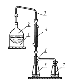 1 - колбонагреватель; 2 - круглодонная колба; 3 - переходная трубка; 4 - холодильник; 5 - насадка; 6 - приемная колба; 7 - контрольная колба Рисунок 1 - Схема установки для определения изотиоцианатов