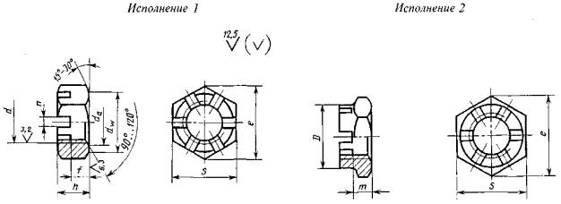 Дата введения 01.01.74 Настоящий стандарт распространяется на низкие прорезные и корончатые шестигранные гайки класса точности А с диаметром резьбы от 6 до 48 мм. Стандарт полностью соответствует СТ СЭВ 2663-89. (Измененная редакция, Изм. № 3). 1. Конструкция и размеры гаек должны соответствовать указанным на чертеже и в таблице.